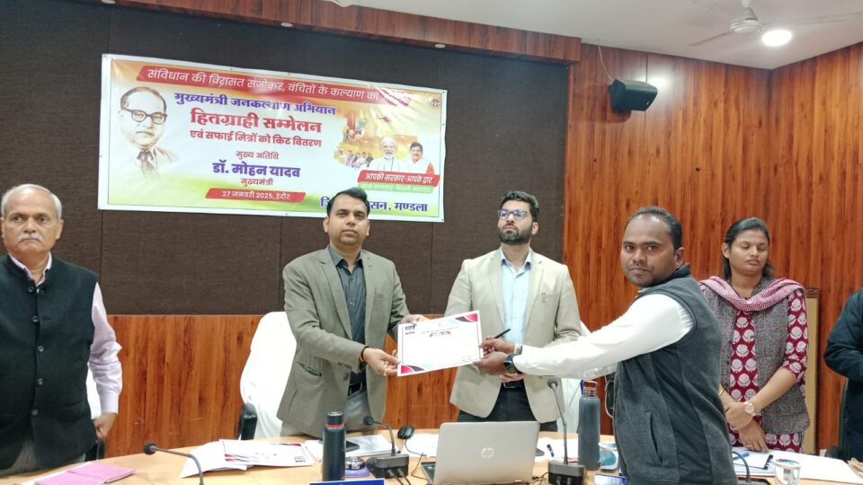 कलेक्टर श्री सोमेश मिश्रा ने दिसंबर माह के सीएम हेल्पलाईन के प्रकरणों के निराकरण में मुख्य कार्यपालन अधिकारी नारायणगंज श्री गौरीशंकर डेहरिया पंचायत एवं ग्रामीण विकास विभाग को 98.52 वेटेज स्कोर के लिए प्रशस्ति पत्र देकर सम्मानित किया। उन्होंने कहा कि शिकायत के निराकरण में संतुष्टि स्तर को बेहतर रखें। इस दौरान सीईओ जिला पंचायत श्रेयांश कूमट, अपर कलेक्टर श्री राजेन्द्र कुमार सिंह, डिप्टी कलेक्टर श्रीमती क्षमा सराफ, श्री आशुतोष ठाकुर सहित संबंधित अधिकारी उपस्थित थे।