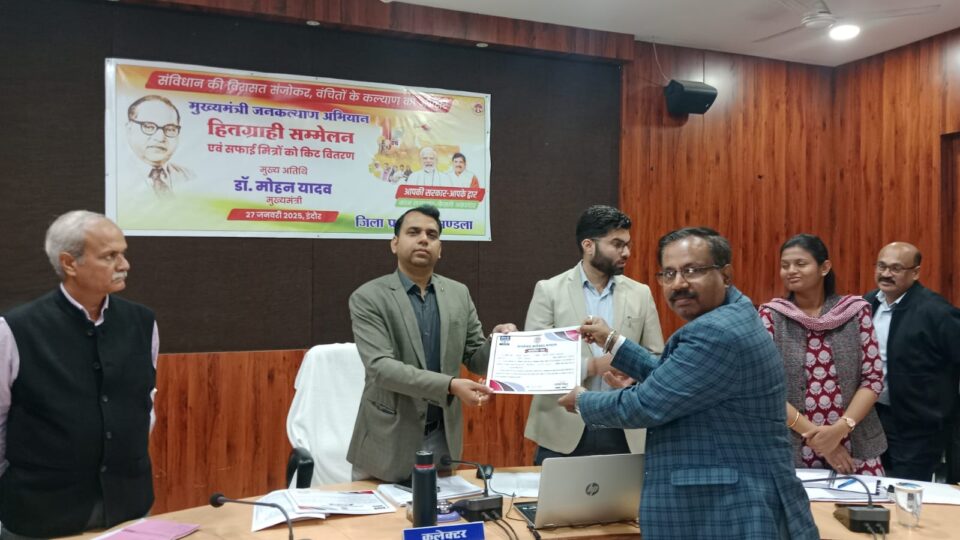 कलेक्टर श्री सोमेश मिश्रा ने दिसंबर माह के सीएम हेल्पलाईन के प्रकरणों के निराकरण में अग्रणी शाखा प्रबंधक श्री सुजय कुमार वित्त विभाग को 95.65 वेटेज स्कोर के लिए प्रशस्ति पत्र देकर सम्मानित किया। उन्होंने कहा कि शिकायत के निराकरण में संतुष्टि स्तर को बेहतर रखें। इस दौरान सीईओ जिला पंचायत श्रेयांश कूमट, अपर कलेक्टर श्री राजेन्द्र कुमार सिंह, डिप्टी कलेक्टर श्रीमती क्षमा सराफ, श्री आशुतोष ठाकुर सहित संबंधित अधिकारी उपस्थित थे।