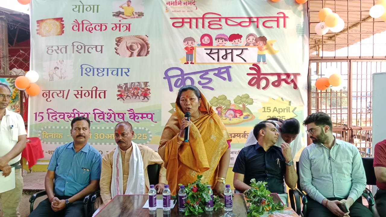 नमामि नर्मदे महा आरती ट्रस्ट द्वारा माहिष्मती घाट में 15 दिवसीय समर कैम्प का आयोजन किया जा रहा है। मंगलवार को कैम्प के शुभारंभ अवसर पर मध्यप्रदेश शासन की लोक स्वास्थ्य यांत्रिकी मंत्री श्रीमती संपतिया उइके ने कहा कि गर्मी की छुट्टियों के इस समय में आयोजित किया जा रहा यह समर कैम्प हमारे बच्चों के सर्वांगीण विकास में सहायक होगा। यह बच्चों को नैतिक शिक्षा के लिए मील का पत्थर साबित होगा। बच्चों को इस तरह से योग, वैदिक मंत्र, शिष्टाचार, चित्रकला, माटीकला आदि का ज्ञान प्राप्त होगा। यह निश्चित ही जिला प्रशासन द्वारा नमामि नर्मदे महा आरती ट्रस्ट की सराहनीय पहल है। आज के बच्चे कल का भविष्य हैं, इन्हें अच्छी शिक्षा देना हमारा कर्तव्य है। इस तरह की शिष्टाचार आधारित नैतिक शिक्षा अवश्य ही बच्चों का भविष्य उज्जवल करेगी। मंत्री श्रीमती संपतिया उइके ने उपस्थित लोगों से अपील करते हुए कहा कि इस कैम्प के विषय में अधिक से अधिक लोगों को जानकारी दें जिससे हमारे बच्चे बड़ी संख्या में इस कैम्प का लाभ उठाएं।