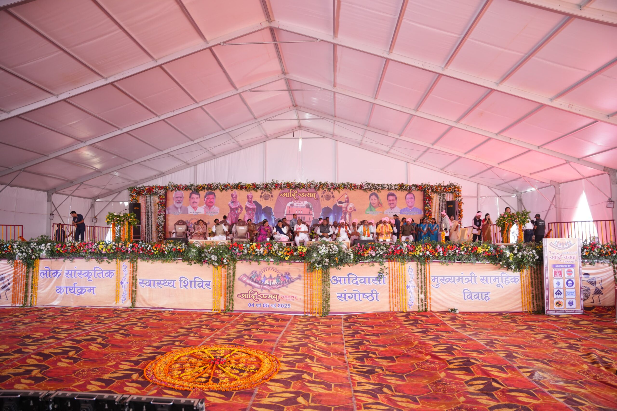 रामनगर में आयोजित हुए आदि उत्सव कार्यक्रम में मप्र शासन के अलावा छत्तीसगढ़ और उत्तरप्रदेश सरकार के मंत्री व विधायक सांसद शामिल हुए। कार्यक्रम में मप्र में लोक स्वास्थ्य यांत्रिकी मंत्री श्रीमती संपतिया उइके, केन्द्रीय राज्यमंत्री जनजातीय कार्य श्री दुर्गादास उइके, केंद्रीय राज्य मंत्री श्रीमती सावित्री ठाकुर महिला बाल विकास, उत्तर प्रदेश सरकार के राज्यमंत्री समाज कल्याण अनु.जा. एवं जन. कल्याण श्री संजीव गौंड़, सांसद श्री फग्गन सिंह कुलस्ते, शहडोल लोकसभा सांसद श्रीमती हिमाद्री सिंह, लोकसभा सांसद कांकेर श्री भोजराज नाग, विधायक बरघाट श्री कमल मर्सकोले, विधायक गोटेगांव श्री महेन्द्र नागेश, विधायक सिहोरा श्री संतोष वरकड़े, विधायक शहपुरा श्री ओमप्रकाश धुर्वे, विधायक धरमपुरी श्री कालूसिंह ठाकुर, विधायक रामकोला उत्तरप्रदेश श्री विनयप्रकाश गौंड़, मंडला जिला पंचायत अध्यक्ष श्री संजय कुशराम, डिंडौरी जिला पंचायत अध्यक्ष श्री रूद्रेश परस्ते, नगरपालिका अध्यक्ष श्री विनोद कछवाहा, पूर्व विधायक श्री देवसिंह सैयाम, श्री रामप्यारे कुलस्ते, श्री शिवराज शाह, श्री पंडित सिंह धुर्वे, जिला भाजपा अध्यक्ष श्री प्रफुल्ल मिश्रा, नगर भाजपा अध्यक्ष शिवारानू राजपूत, कलेक्टर श्री सोमेश मिश्रा, पुलिस अधीक्षक श्री रजत सकलेचा, सीईओ जिला पंचायत श्री श्रेयांश कूमट, अपर कलेक्टर श्री राजेन्द्र कुमार सिंह एवं अपर कलेक्टर श्री अरविंद सिंह, अतिरिक्त पुलिस अधीक्षक श्री शिवकुमार वर्मा मौजूद रहे। कार्यक्रम का संचालन श्री अखिलेश उपाध्याय एवं श्री दिलीप मरकाम ने किया।