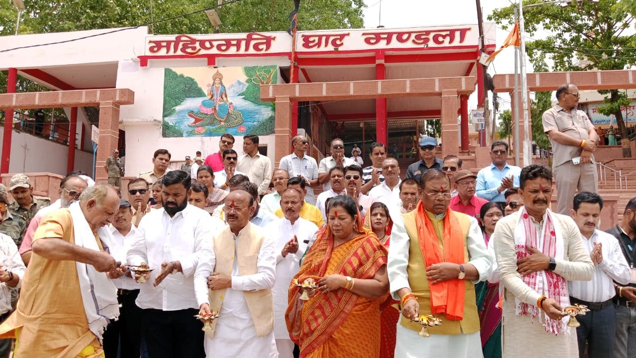 प्रदेश शासन के कुटीर एवं ग्रामोद्योग राज्यमंत्री (स्वतंत्र प्रभार) तथा जिले के प्रभारी मंत्री श्री दिलीप जायसवाल, प्रदेश शासन की लोक स्वास्थ्य यांत्रिकी मंत्री श्रीमती संपतिया उइके और सांसद श्री फग्गन सिंह कुलस्ते ने गुरूवार को माहिष्मती घाट में माँ नर्मदा जी की पूजा-अर्चना कर प्रदेश व जिलेवासियों के कल्याण की कामना की। उन्होंने इस अवसर पर माँ नर्मदा जी की भव्य महाआरती की। नर्मदा नदी में दीप प्रवाहित कर प्रणाम किए। इस अवसर पर जिला पंचायत अध्यक्ष श्री संजय कुशराम, नगरपालिका अध्यक्ष श्री विनोद कछवाहा, जिला भाजपा अध्यक्ष श्री प्रफुल्ल मिश्रा, नगर भाजपा अध्यक्ष श्री शिवारानू राजपूत, कलेक्टर श्री सोमेश मिश्रा, जिला पंचायत सीईओ श्री श्रेयांश कूमट, अपर कलेक्टर श्री राजेन्द्र कुमार सिंह, अतिरिक्त पुलिस अधीक्षक श्री शिवकुमार वर्मा सहित श्रद्धालुजन मौजूद थे।