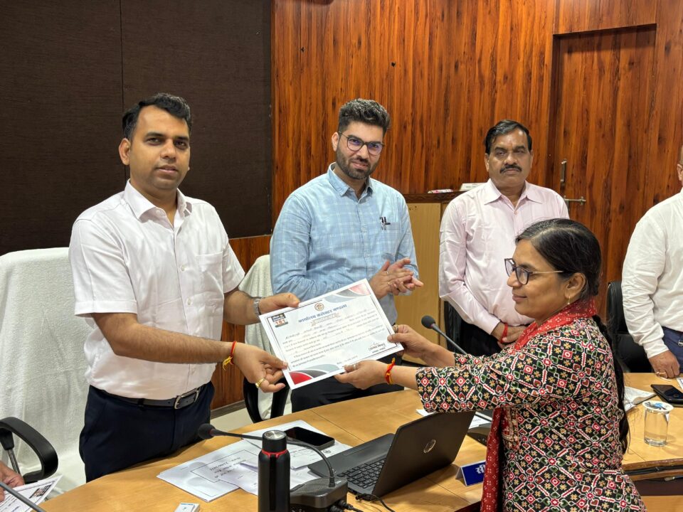 कलेक्टर श्री सोमेश मिश्रा ने मई माह के सीएम हेल्पलाईन के प्रकरणों के निराकरण में श्रीमति शालिनी तिवारी, जिला कार्यक्रम अधिकारी, महिला एवं बाल विकास विभाग को 90.57 वेटेज स्कोर के लिए प्रशस्ति पत्र देकर सम्मानित किया। उन्होंने कहा कि शिकायत के निराकरण में संतुष्टि स्तर को बेहतर रखें। इस दौरान सीईओ जिला पंचायत श्रेयांश कूमट, अपर कलेक्टर श्री राजेन्द्र कुमार सिंह, संयुक्त कलेक्टर सीएल वर्मा डिप्टी कलेक्टर क्षमा सराफ सहित समस्त एसडीएम तथा संबंधित अधिकारी उपस्थित थे।