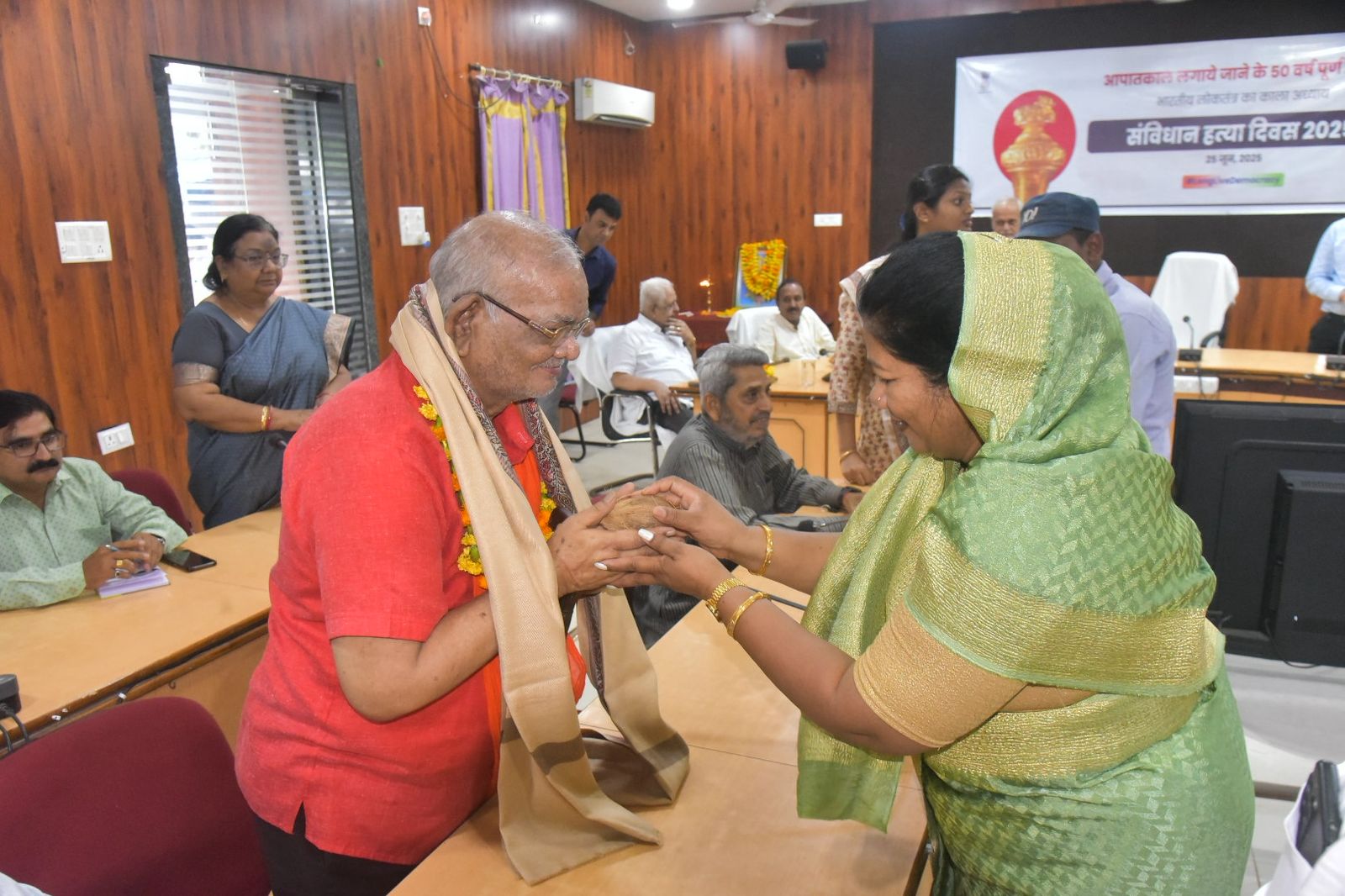 योजना भवन में 25 जून को आपातकाल के 50 वर्ष पूरे होने पर संविधान हत्या दिवस आयोजित कर इमरजेंसी की विभीषिका के विषय में लोगों को जानकारी देने के लिए कार्यक्रम का आयोजन किया गया। इस कार्यक्रम के दौरान वर्ष 1975 के मीसाबंदियों एवं उनके परिवारजनों का सम्मान किया गया। लोगों को संबोधित करते हुए मध्यप्रदेश की लोक स्वास्थ्य यांत्रिकी मंत्री श्रीमती संपतिया उइके ने कहा कि पूर्व प्रधानमंत्री स्वर्गीय श्रीमती इंदिरा गांधी द्वारा अपनी कुर्सी बचाने के लिए 25 जून 1975 को देश पर इमरजेंसी थोपी इसके बाद विपक्ष के नेताओं को जबरन जेलों में डाला गया। आज का फलता-फूलता लोकतंत्र आपातकाल के संघर्ष का परिणाम है। मीसाबंदियों पर जेलों में अत्याचार किए गए। आपातकाल की इस विभीषिका को लोग जानें और समझें इसलिए प्रधानमंत्री श्री नरेन्द्र मोदी ने इमरजेंसी के 50 वर्ष पूरे होने पर पूरे देश में लोकतंत्र हत्या दिवस आयोजित कराने का निर्णय लिया है। उन्होंने कहा कि लोकतंत्र के सेनानियों ने इमरजेंसी के दौरान किए गए अत्याचारों के सामने घुटने नहीं टेके और लोकतंत्र को मजबूत करने के लिए संघर्ष किया, जिसका परिणाम था कि 1977 के चुनाव में पूर्व प्रधानमंत्री स्वर्गीय श्रीमती इंदिरा गांधी को हार का सामना करना पड़ा। आज हमें उन लोकतंत्र सेनानियों का सम्मान करने का अवसर मिला है उन्होंने इस देश के महान लोकतंत्र का बचाने के लिए जेल तक जाना स्वीकार किया था। आज लघु फिल्म के माध्यम से इमरजेंसी की वास्तविकता लोगों को बताई गई। ऐसी लघु फिल्मों का प्रदर्शन हमें समाज के सामने करना चाहिए जिससे लोग लोकतंत्र के उस काले अध्याय के बारे में जान सकें।