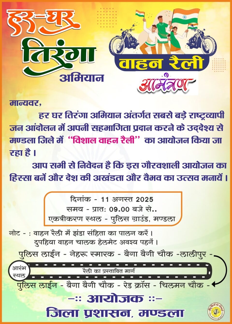 हर घर तिरंगा अभियान अंतर्गत सबसे बड़े राष्ट्रव्यापी जन आंदोलन में अपनी सहभागिता प्रदान करने के उद्देश्य से मण्डला जिले में विशाल वाहन रैली का आयोजन किया जा रहा है। जिला प्रशासन द्वारा लोगों से अपील की गई है कि इस गौरवशाली आयोजन का हिस्सा बनें और देश की अखंडता और वैभव का उत्सव मनायें। 11 अगस्त 2025 को प्रातः 9 बजे से पुलिस ग्राउंड मण्डला में विशाल वाहन रैली में झंडा संहिता का पालन करते हुए दुपहिया वाहन चालक हेलमेट पहनकर भाग लेंगे। रैली का प्रस्तावित मार्ग पुलिस लाईन – नेहरू स्मारक – बैगा बैगी चैक – लालीपुर – चिलमन चैक – रेडक्रॉस – बैगा बैगी चैक होते हुए पुलिस लाईन ग्राउंड में समाप्त होगी।