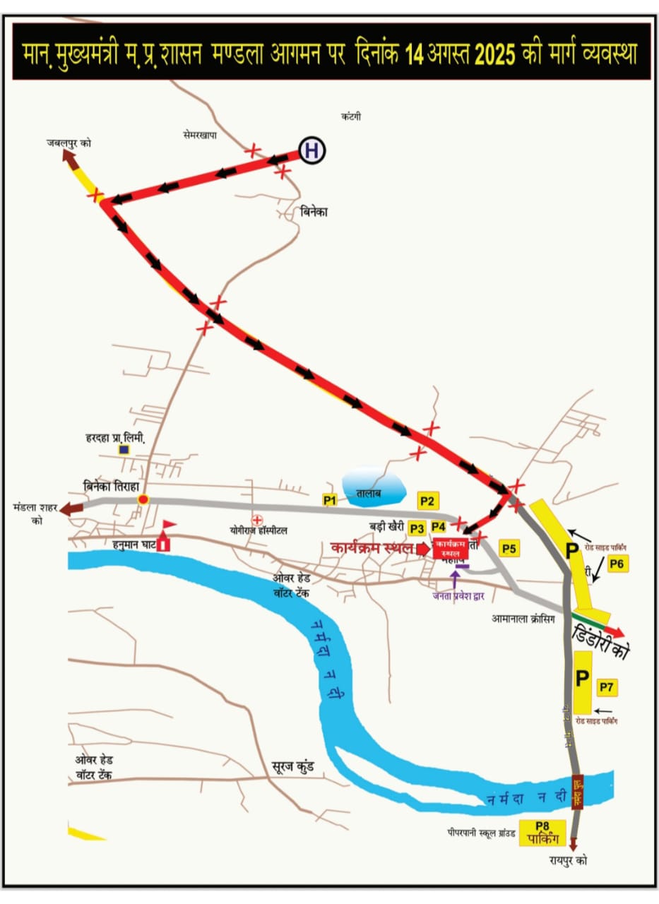 14 अगस्त 2025 को जिला मंडला आयोजित कार्यक्रम में मुख्यमंत्री डॉ. मोहन यादव के आगमन एवं कार्यक्रम के दौरान अधिक संख्या में लोगों के सम्मिलित होने की संभावना है। इस अवसर पर सुरक्षा व सुगम यातायात की दृष्टि से विशिष्ट अतिथियों की कार पार्किंग कॉलेज के सामने होगी। समस्त शासकीय अधिकारियों, मंचासीन विशिष्ट अतिथियों के वाहनों की पार्किंग व्यवस्था वेयरहाउस परिसर में की गई है। मेला स्थल बड़ी खैरी में दो पहिया वाहनों की पार्किंग व्यवस्था की गई है। एकीकृत प्राथमिक शाला मैदान बड़ी खैरी में मंडला की ओर से कार्यक्रम में आने वाले फोर व्हीलर वाहनों की पार्किंग व्यवस्था रहेगी। प्राथमिक शाला मैदान पीपरपानी में नैनपुर, मवई, बिछिया की ओर से कार्यक्रम में आने वाले समस्त छोटे व अन्य वाहनों की पार्किंग व्यवस्था की गई है। मंडला ब्लॉक, मवई एवं घुघरी से कार्यक्रम में आने वाले समस्त वाहन डिंडोरी रोड के पास पार्क होंगे। बीजाडांडी, नारायणगंज, निवास, नैनपुर, बिछिया से आने वाली बसें व अन्य वाहन जंतीपुर क्रॉसिंग के बाद हाईवे के पास पार्क होंगे।
