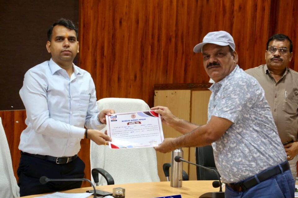 कलेक्टर श्री सोमेश मिश्रा ने जुलाई माह के सीएम हेल्पलाईन के प्रकरणों के निराकरण में ऊर्जा विभाग के अधीक्षण अभियंता मो. अयूब खान को 100 प्रतिशत वेटेज स्कोर के लिए प्रशस्ति पत्र देकर सम्मानित किया। उन्होंने कहा कि शिकायत के निराकरण में संतुष्टि स्तर को बेहतर रखें। इस दौरान अपर कलेक्टर श्री राजेन्द्र कुमार सिंह, सहायक कलेक्टर आकिप खान, डिप्टी कलेक्टर श्रीमती क्षमा सराफ सहित समस्त एसडीएम तथा संबंधित अधिकारी उपस्थित थे।