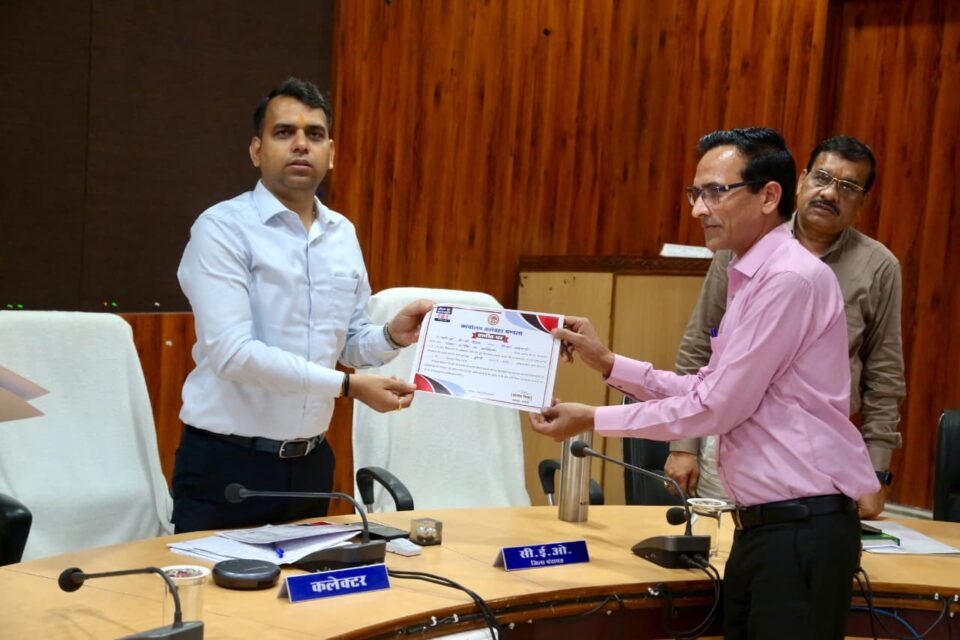 कलेक्टर श्री सोमेश मिश्रा ने जुलाई माह के सीएम हेल्पलाईन के प्रकरणों के निराकरण में योजना आर्थिक एवं सांख्यिकी विभाग के योजना अधिकारी श्री ओपी सिरसे को 100 प्रतिशत वेटेज स्कोर के लिए प्रशस्ति पत्र देकर सम्मानित किया। उन्होंने कहा कि शिकायत के निराकरण में संतुष्टि स्तर को बेहतर रखें। इस दौरान अपर कलेक्टर श्री राजेन्द्र कुमार सिंह, सहायक कलेक्टर आकिप खान, डिप्टी कलेक्टर श्रीमती क्षमा सराफ सहित समस्त एसडीएम तथा संबंधित अधिकारी उपस्थित थे।