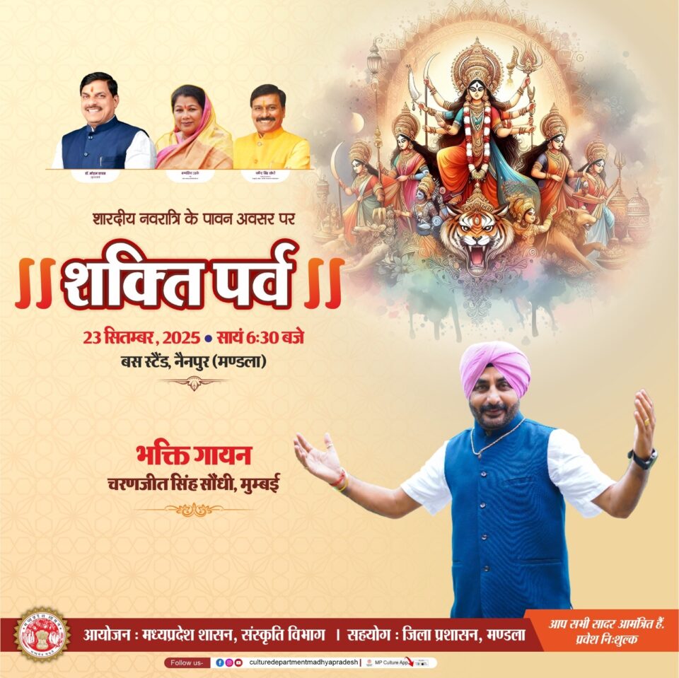 संस्कृति विभाग म.प्र. शासन द्वारा शारदीय नवरात्रि के पावन अवसर पर “शक्ति पर्व” का आयोजन 23 सितंबर को सायं 6:30 बजे से बस स्टैंड नैनपुर में किया जाएगा। इस प्रदेश स्तरीय महोत्सव में लोक-भक्ति गायन और आदि शक्ति को समर्पित नृत्य नाटिका के माध्यम से देवी के वैभव और महिमा को विभिन्न कला रूपों के माध्यम से प्रदर्शित किया जाएगा। मुंबई के चरणजीत सिंह सौंधी अपने स्वरचित भजनों के माध्यम से माता की आराधना में डूबे श्रोताओं को भक्ति रस की धारा में भिगो देंगे।