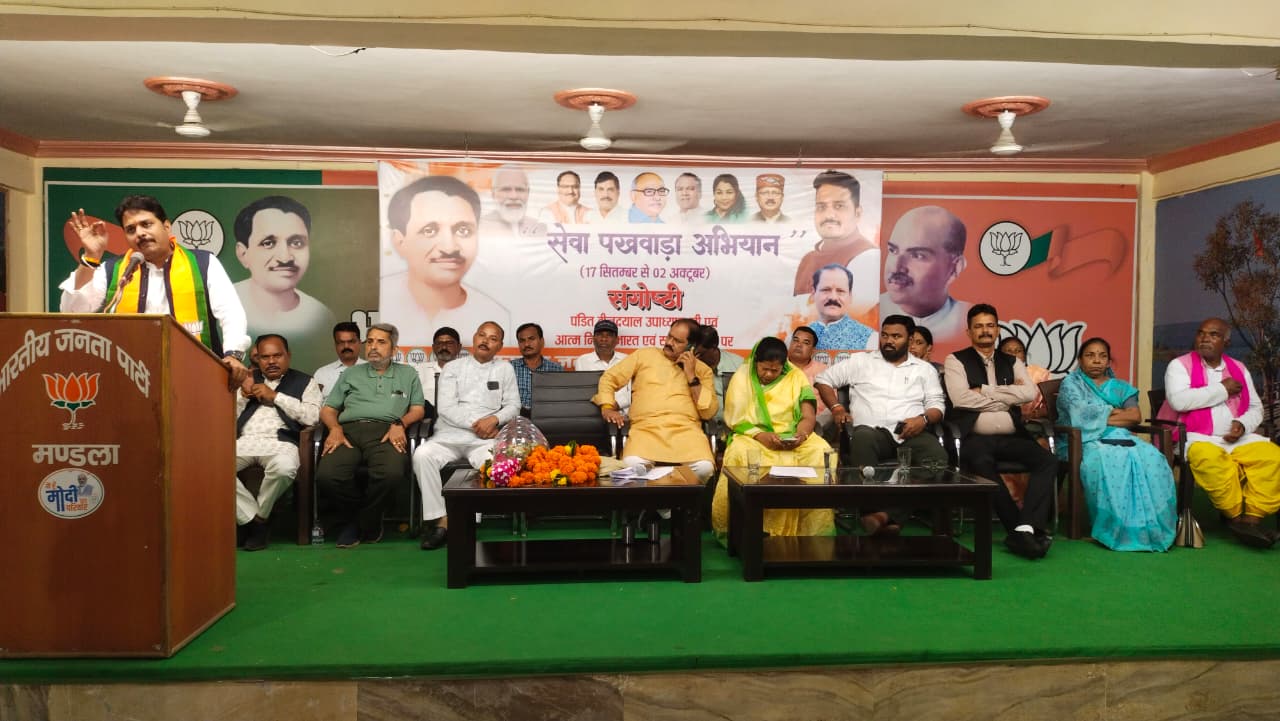 मंडला। भारतीय जनता पार्टी जिला कार्यालय में आत्मनिर्भर भारत संकल्प अभियान तथा सेवा पखवाड़ा के अंतर्गत जनसंघ के संस्थापक पंडित दीनदयाल उपाध्याय की जयंती पर भव्य संगोष्ठी का आयोजन किया गया। कार्यक्रम का शुभारंभ मंचासीन अतिथियों द्वारा पंडित दीनदयाल उपाध्याय, भारत माता और श्यामा प्रसाद मुखर्जी के तैल चित्र पर माल्यार्पण एवं दीप प्रज्वलन से किया गया। कार्यक्रम के मुख्य अतिथि भाजपा युवा मोर्चा के प्रदेश अध्यक्ष वैभव पवार एवं कैबिनेट मंत्री व मंडला विधायक संपतिया उइके ने पंडित दीनदयाल उपाध्याय के जीवन, विचारधारा और एकात्म मानववाद पर विस्तार से प्रकाश डाला। मंत्री संपतिया उइके ने कहा कि पंडित दीनदयाल उपाध्याय ऐसे महान पुरुष थे जिन्होंने भारत की आत्मा को समझते हुए राष्ट्र को स्वदेशी और आत्मनिर्भरता का मार्ग दिखाया। उन्होंने कहा कि कार्यकर्ताओं की सक्रियता और सेवा भावना ही भारतीय जनता पार्टी को देश की सबसे सशक्त राजनीतिक शक्ति बनाती है।