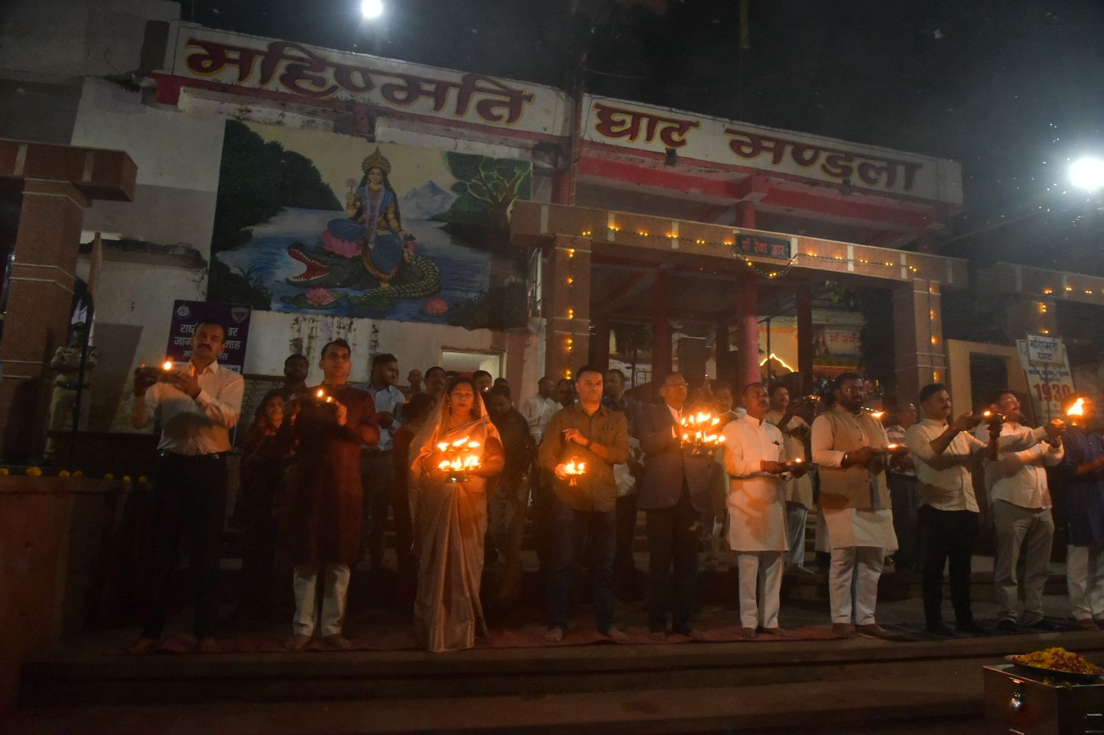 नमामि नर्मदे महा आरती ट्रस्ट और जिला प्रशासन की ओर से छोटी दीपावली पर माहिष्मती घाट पर भव्य दीपोत्सव आयोजित किया गया। मध्यप्रदेश की लोक स्वास्थ्य यांत्रिकी मंत्री श्रीमती सम्पतिया उईके, सांसद श्री फग्गन सिंह कुलस्ते, जिला पंचायत अध्यक्ष श्री संजय कुशराम, नगर पालिका परिषद अध्यक्ष श्री विनोद कछवाहा, ने कलेक्टर श्री सोमेश मिश्रा, पुलिस अधीक्षक श्री रजत सकलेचा, सीईओ जिला पंचायत श्री शाश्वत सिंह मीना के साथ दीप प्रज्‍वलित कर दीपोत्सव में हिस्सा लिया।