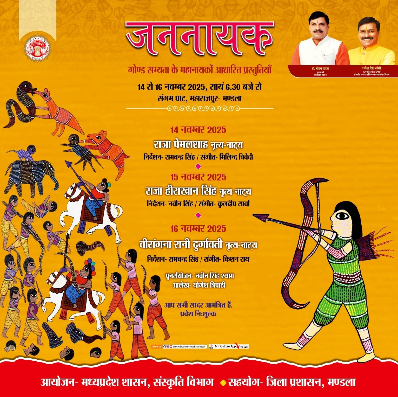 मध्यप्रदेश शासन, संस्कृति विभाग एवं जिला प्रशासन के सहयोग से गोंड साम्राज्य के 52 गढ़ों में से पहले चरण में 30 गढ़ों में प्रस्तुतियों का तीन दिवसीय समारोह जननायक आयोजित किया जा रहा है। गतिविधि अंतर्गत 14 से 16 नवंबर 2025 तक विनोद मंच, बस स्टैंड बिछिया जिला मंडला, निषादराज भवन, इनडोर स्टेडियम के पास मंडला में संयोजित किया जा रहा है। गतिविधि में स्वतंत्र्य समर की अप्रतिम गोंड नायिका वीरांगना रानी दुर्गावती, राजा पेमलशाह एवं राजा हीराखान सिंह नृत्य नाट्य की प्रस्तुति दी जा रही है। विभाग की ओर से प्रस्तुतियों का निर्देशन एवं पुनर्संयोजन श्री रामचंद्र सिंह, श्री नवीन सिंह श्याम, श्री आशीष पटेल द्वारा कराया गया है।