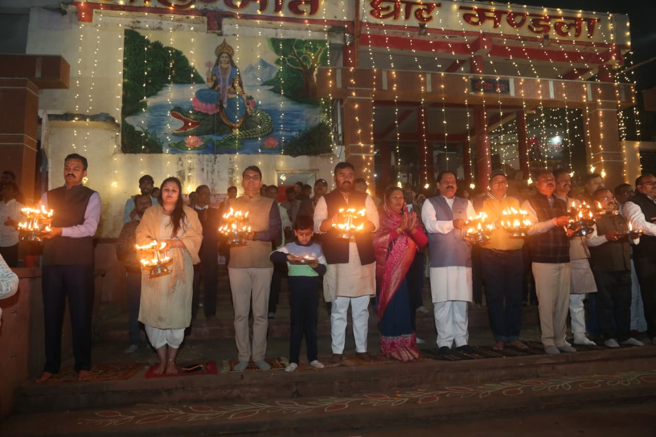 शनिवार 15 नवंबर को भगवान बिरसा मुंडा की 150वीं जयंती पर जनजातीय गौरव दिवस और मंडला गौरव दिवस के अवसर पर नर्मदा तट के माहिष्मती घाट पर भव्य पंचचौकी महाआरती माँ नर्मदा को समर्पित की गई। श्री नर्मदापूजन के पश्चात नर्मदाष्टक का पाठ किया गया, इसके बाद समवेत स्वरों में माँ नर्मदा की आरती की गई। जनजातीय गौरव दिवस एवं मंडला गौरव दिवस में आयोजित कार्यक्रमों की श्रृंखला में माँ नर्मदा की महाआरती के पश्चात भव्य आतिशबाजी भी की गई। उपस्थित समस्त जनप्रतिनिधियों एवं प्रशासनिक अधिकारियों ने आरती के पश्चात माँ नर्मदा का दुग्धाभिषेक कर दीपदान किया।