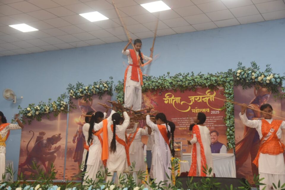 आयोजकों द्वारा उपस्थित अतिथियों को श्रीमद्भगवद्गीता की प्रतीक प्रति भेंट कर सम्मानित किया गया। सांस्कृतिक प्रस्तुतियों ने कार्यक्रम को और भी आकर्षक बना दिया। काशी विश्वनाथ वैदिक गुरुकुल तथा महर्षि विद्या मंदिर के बच्चों ने प्रेरणादायी गीत प्रस्तुत कर श्रोताओं का मन जीत लिया।टीम नटराज ने राष्ट्रगीत वंदे मातरम् पर आकर्षक नृत्य प्रस्तुति देकर सभागार में राष्ट्रभावना का उत्साह भर दिया। आर्य वीरांगना दल की छात्राओं ने शस्त्र एवं लाठी-कला का प्रभावशाली प्रदर्शन कर भारतीय परंपरा और वीरता की झलक प्रस्तुत की। उनकी प्रस्तुति पर दर्शकों ने तालियों की गड़गड़ाहट से स्वागत किया। कार्यक्रम में श्रीमद्भगवद्गीता के अध्याय का सामूहिक पाठ भी कराया गया।