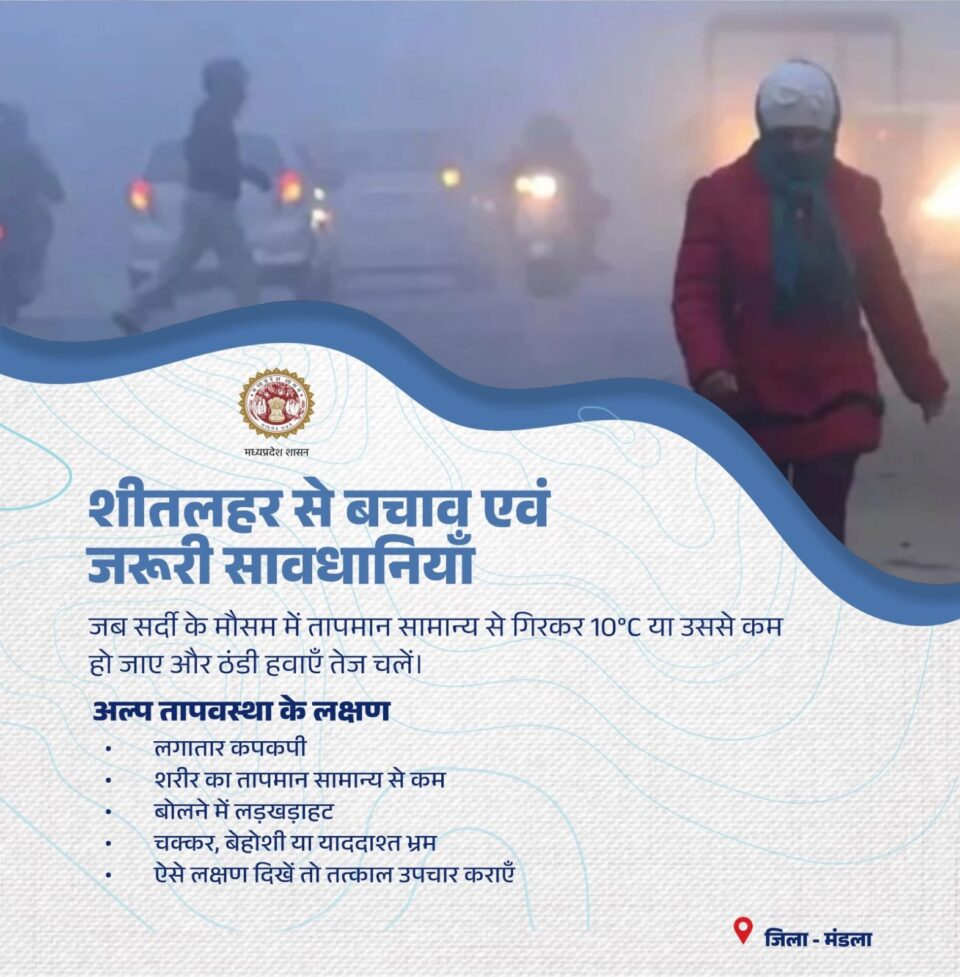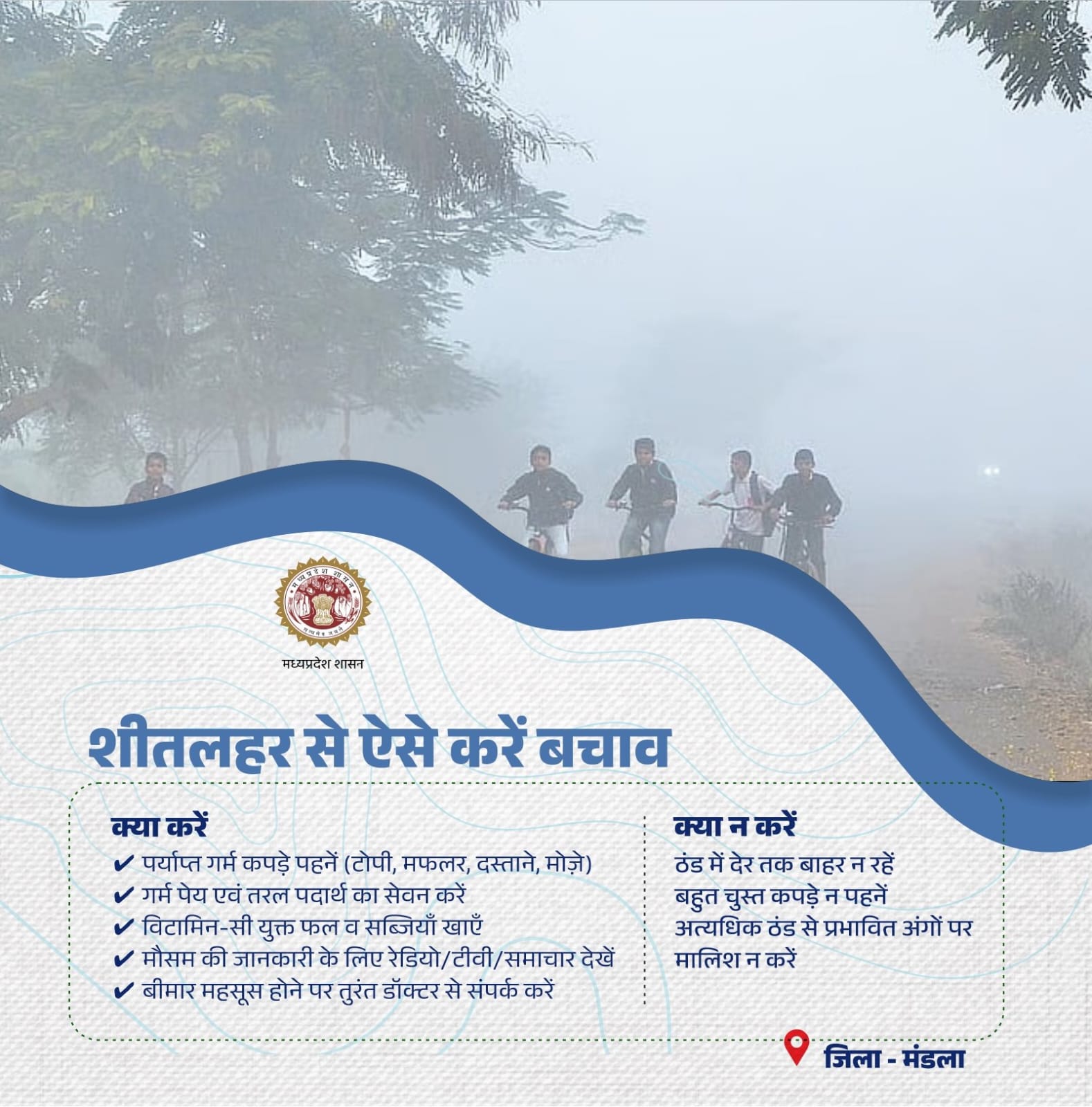 मुख्य चिकित्सा एवं स्वास्थ्य अधिकारी डॉ. डी.जे. मोहंती ने बताया कि इन समस्याओं से बचाव कर लिया जाये तो इस मौसम का सामना किया जा सकता है। सर्दी के मौसम में जब ठंडी हवाएं तेजी से चलने लगती है, तापमान में तेजी से गिरावट होने लगती है तब इस स्थिति को शीतलहर कहते हैं। आसान शब्दों में कहा जा सकता है कि सर्दी के मौसम में न्यूनतम तापमान 10 डिग्री सेल्सियस से लेकर 4-5 डिग्री नीचे चला जाता है तो इसे शीतलहर कहा जाता है। स्थानीय मौसम पूर्वानुमान के लिए रेडियो, टीवी एवं समाचार पत्र जैसे सभी मीडिया द्वारा जानकारी का अनुसरण किया जा सकता है।