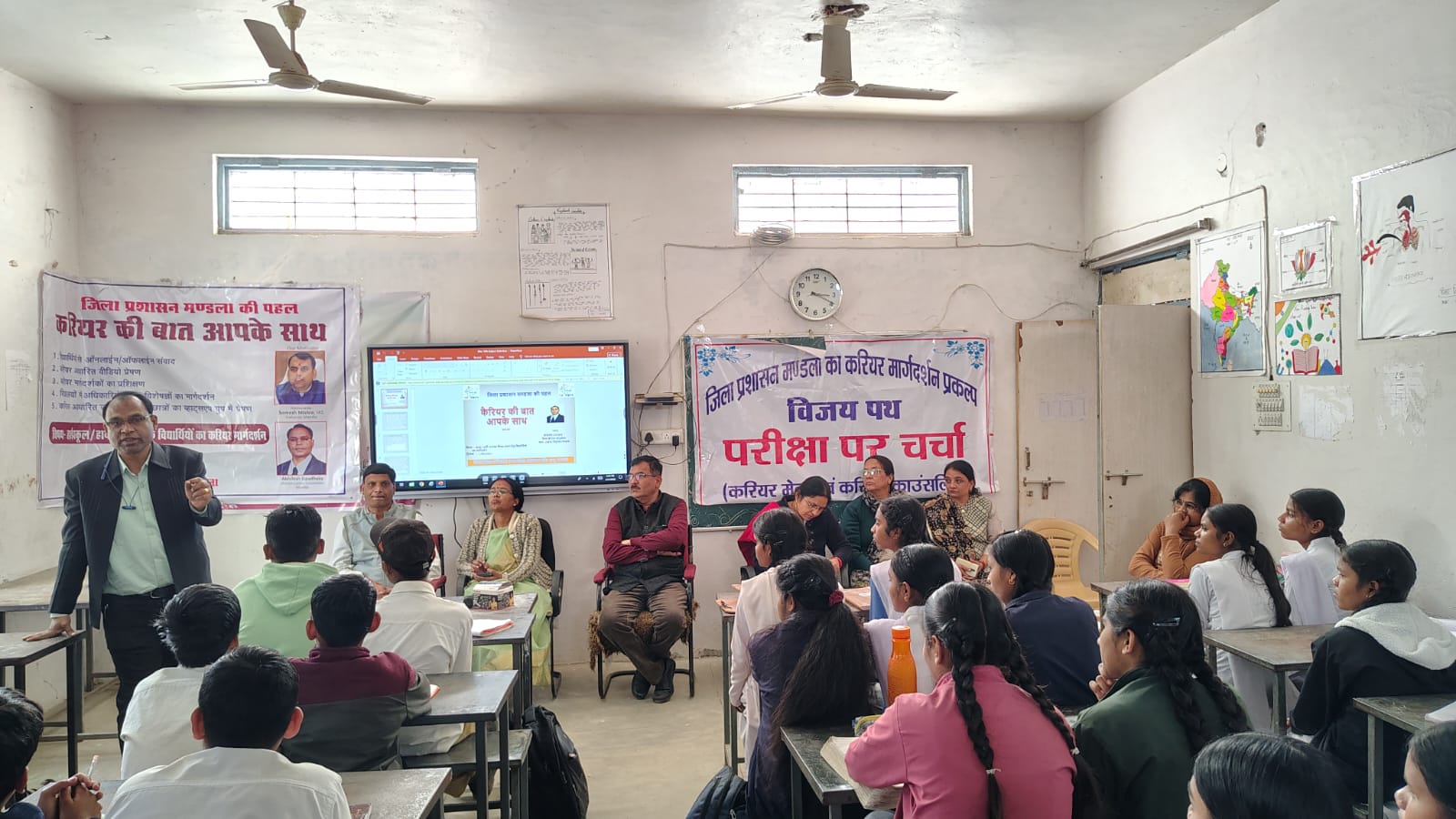 शासकीय हाईस्कूल बिंझिया में विद्यार्थियों को भविष्य की चुनौतियों के प्रति सजग करने और सही करियर चुनाव में मदद करने के उद्देश्य से कैरियर मार्गदर्शन कार्यशाला का  आयोजन किया गया। इस कार्यक्रम में कैरियर काउंसलर श्री अखिलेश उपाध्याय ने छात्रों को सफलता के गुरुमंत्र दिए। उन्होंने कार्यशाला को संबोधित करते हुए कहा कि 10वीं कक्षा विद्यार्थी के जीवन का सबसे महत्वपूर्ण पड़ाव होता है। छात्रों को अपनी रुचि और क्षमता के आधार पर ही संकाय का चुनाव करना चाहिए। उन्होंने विज्ञान, कला, वाणिज्य और कृषि जैसे पारंपरिक क्षेत्रों के साथ-साथ आधुनिक युग के उभरते कैरियर विकल्पों जैसे डेटा साइंस और डिजिटल मीडिया की भी जानकारी दी। वर्तमान समय में स्वरोजगार की महत्ता को रेखांकित करते हुए बताया कि केवल सरकारी नौकरी ही एकमात्र विकल्प नहीं है। उन्होंने आईटीआई, डिप्लोमा कोर्सेज और प्रधानमंत्री कौशल विकास योजना के अंतर्गत संचालित विभिन्न अल्पविधि  रोजगारोन्मुखी पाठ्यक्रमों के बारे में विस्तार से बताया, जो कम समय में छात्रों को आर्थिक रूप से आत्मनिर्भर बना सकते हैं। आगामी बोर्ड परीक्षाओं को ध्यान में रखते हुए विद्यार्थियों को समय प्रबंधन, तनाव मुक्त पढ़ाई और उत्तर पुस्तिका में प्रभावी ढंग से लिखने की तकनीकें सिखाईं। उन्होंने छात्रों से कहा कि दृढ़ संकल्प और निरंतर अभ्यास ही सफलता की कुंजी है।