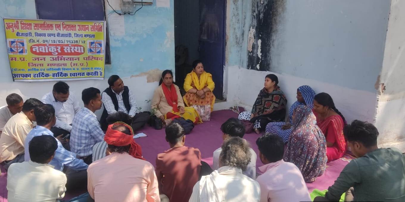 गुरुवार को सेक्टर क्रमांक 1 बीजाडांडी अंतर्गत नवांकुर संस्था ’अनुश्री शिक्षा सामाजिक एवं निशक्त उत्थान समिति, बीजाडांडी’ द्वारा ग्राम विजयपुर में ग्राम विकास प्रस्फुटन समिति की बैठक आयोजित की गई। बैठक में जिला समन्वयक श्री राजेन्द्र चौधरी ने समिति द्वारा किए जाने वाले विभिन्न कार्यों पर विस्तारपूर्वक चर्चा की तथा शासन की विभिन्न जनकल्याणकारी योजनाओं की जानकारी प्रदान की। उन्होंने समिति सदस्यों को योजनाओं का लाभ पात्र हितग्राहियों तक पहुंचाने के लिए सक्रिय भूमिका निभाने के लिए प्रेरित किया। कार्यक्रम में विकासखण्ड समन्वयक मंजुलता पांडेय, नवांकुर संस्था प्रमुख श्री हरिलाल परते (चरगांवमाल), श्री जगत सिंह परते (धनवाही), परामर्शदाता आदित्य मिश्रा एवं श्रद्धा तिवारी सहित समिति के अध्यक्ष श्री विक्रम सिंह मरकाम, सचिव श्री कमलेश विश्वकर्मा एवं अन्य सदस्यगण तथा ग्रामवासी उपस्थित रहे।